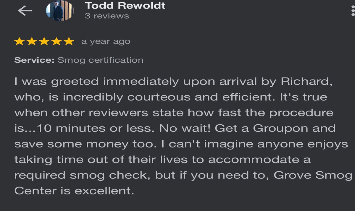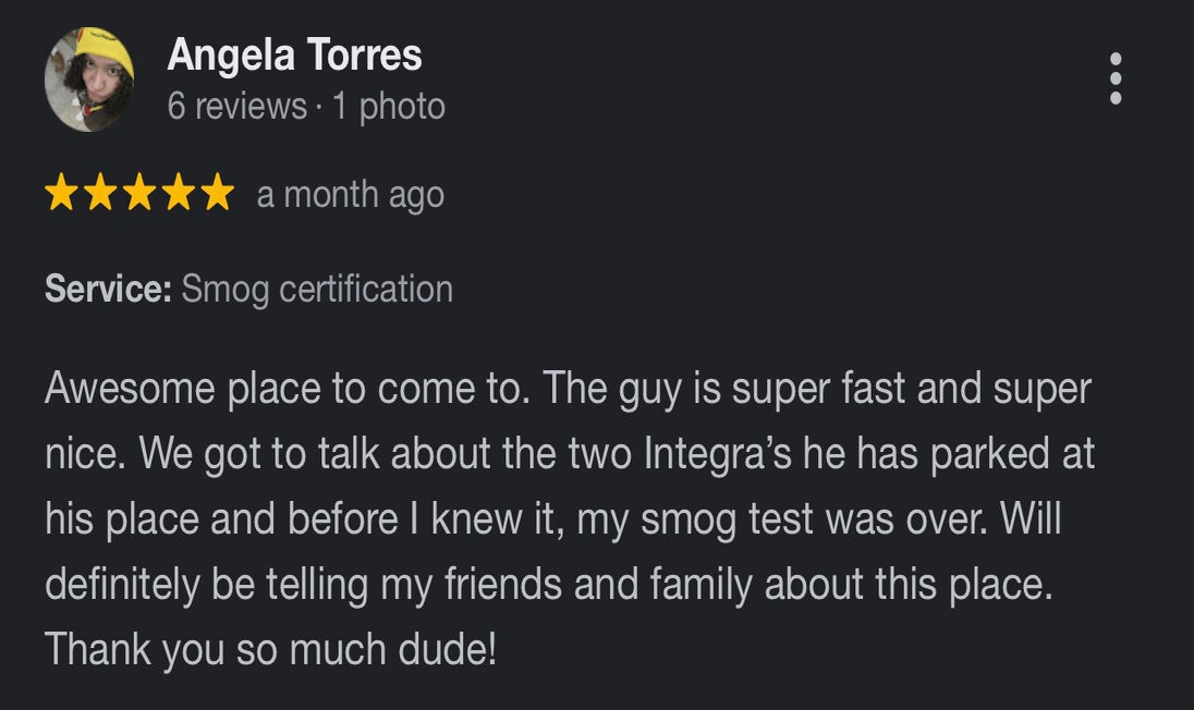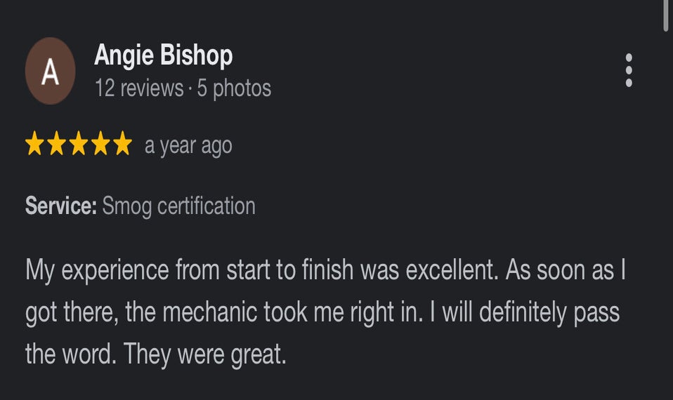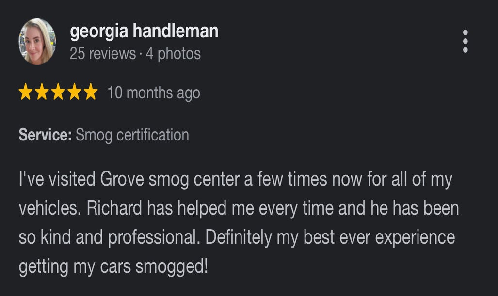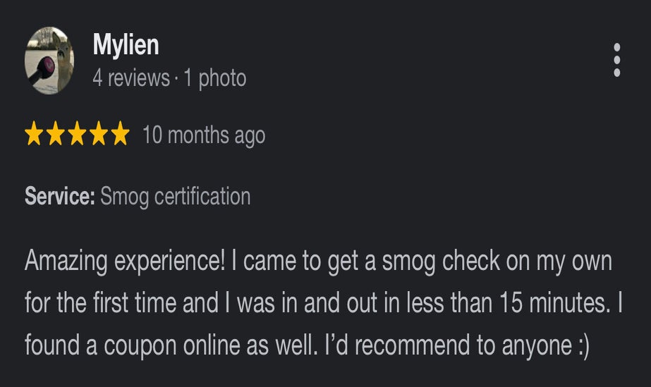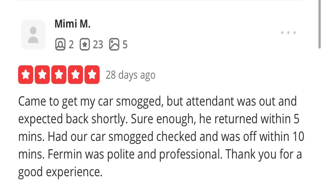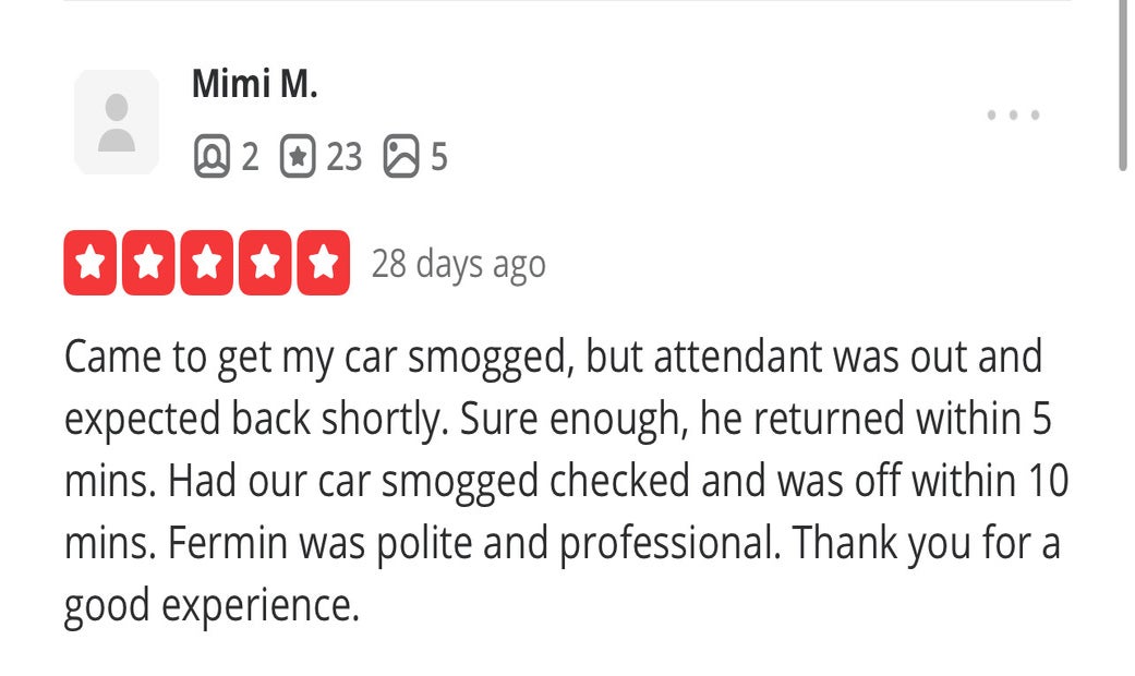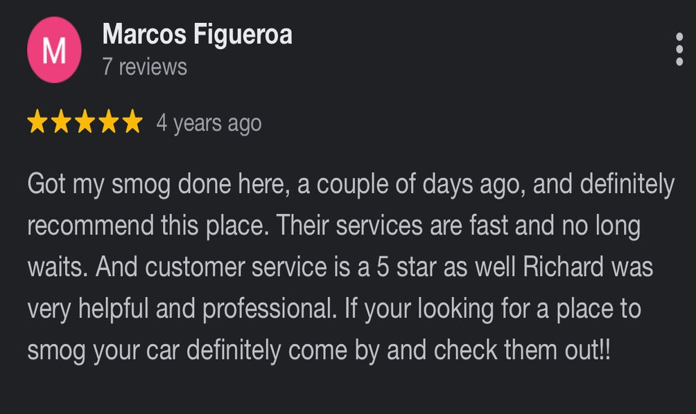 Super fast and terrific service at Vista Smog Center. Needed a Star station qualified smog check and got right in. Fifteen minutes between driving up and driving out. Online coupon brought the cost of testing my 2004 F-250 to less than $50. Additionally, Axel offered insight on an installed after market catalytic converter (didn’t know my truck had one) and PCV valve.
